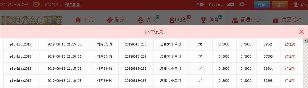 【恒耀娱乐】河内五分彩争霸赛!第007期第4天(06月13日) |
