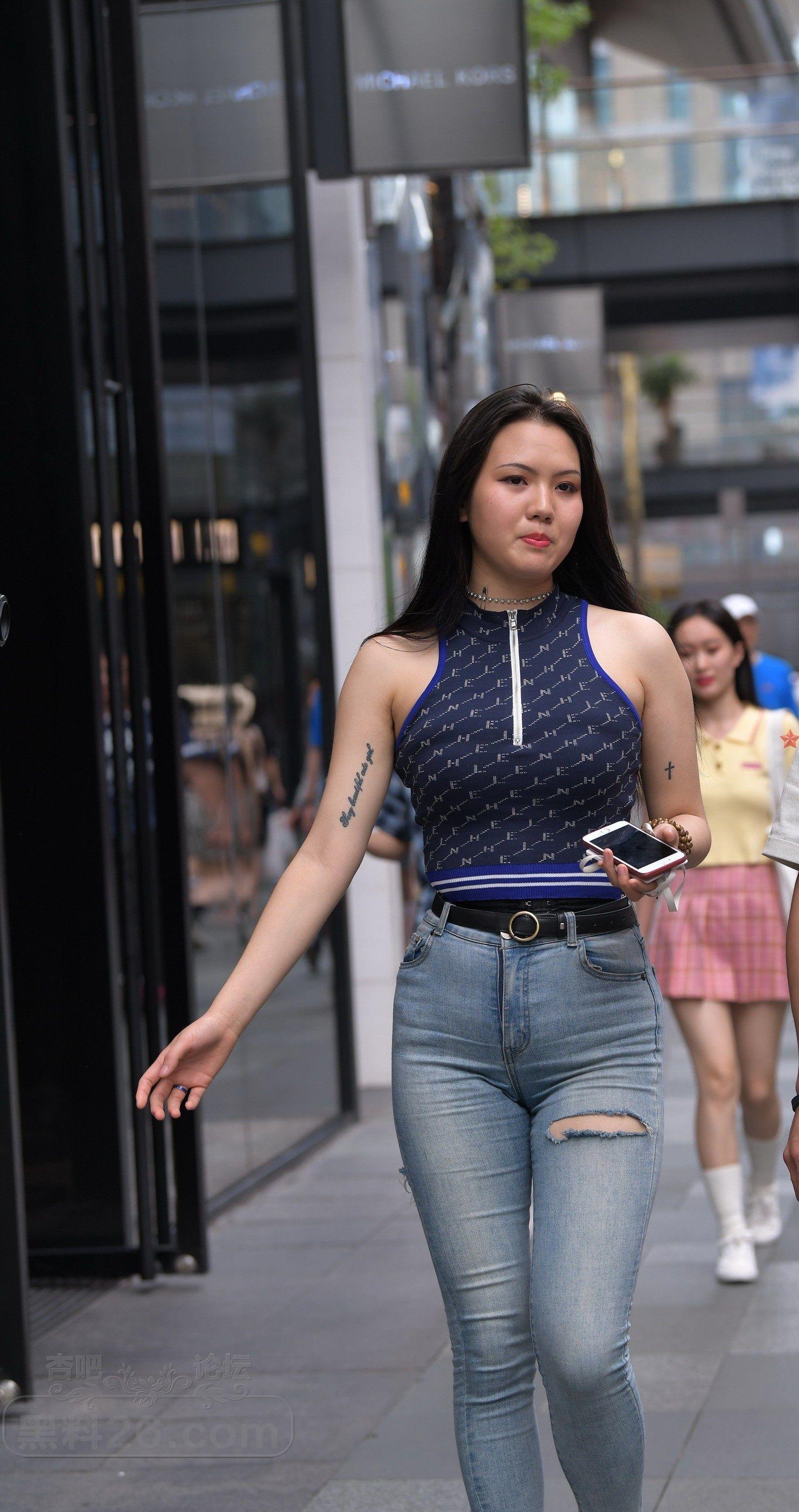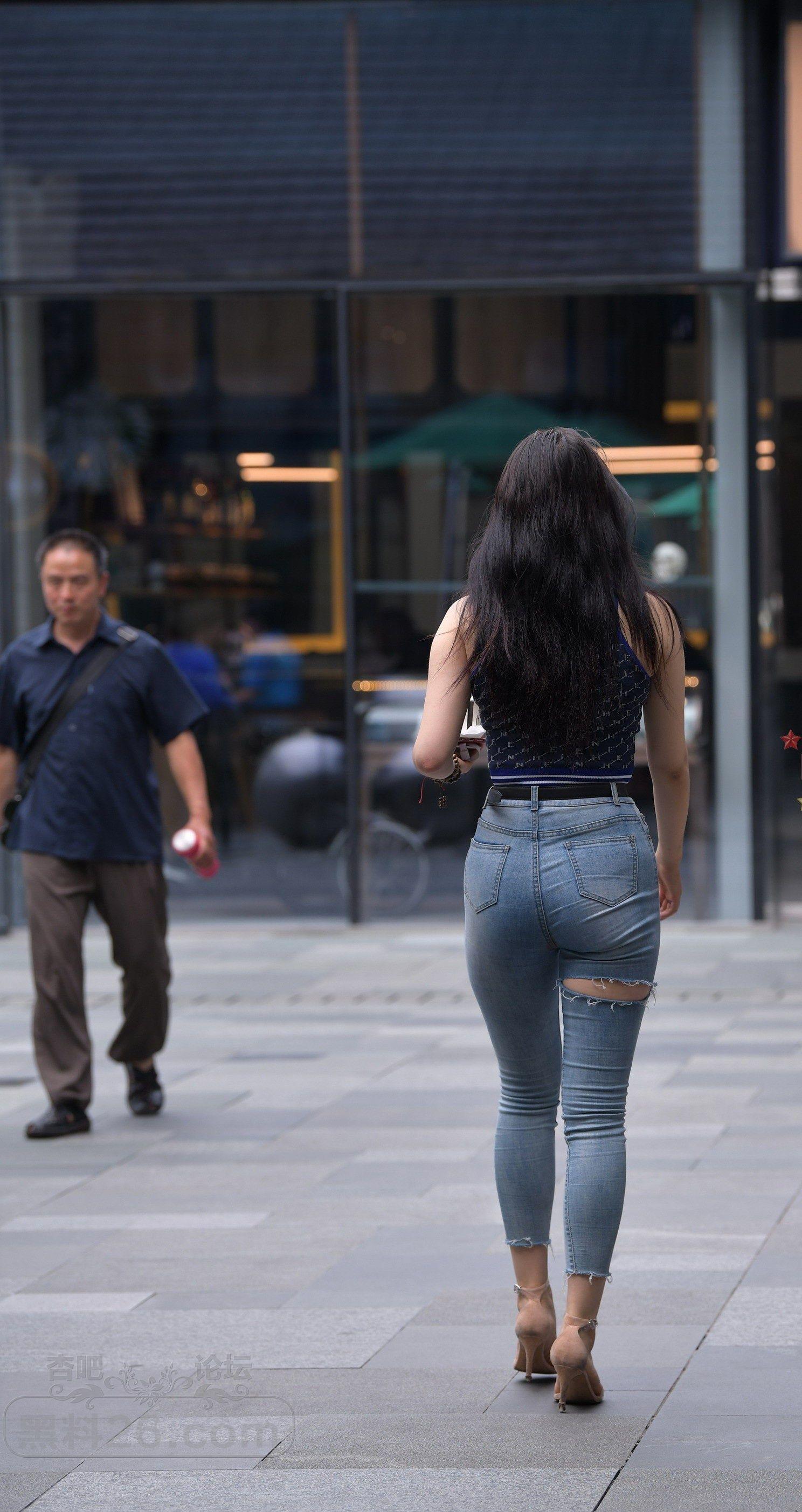 黑色背心破洞牛仔紧身裤长发美女屁股翘【10P】